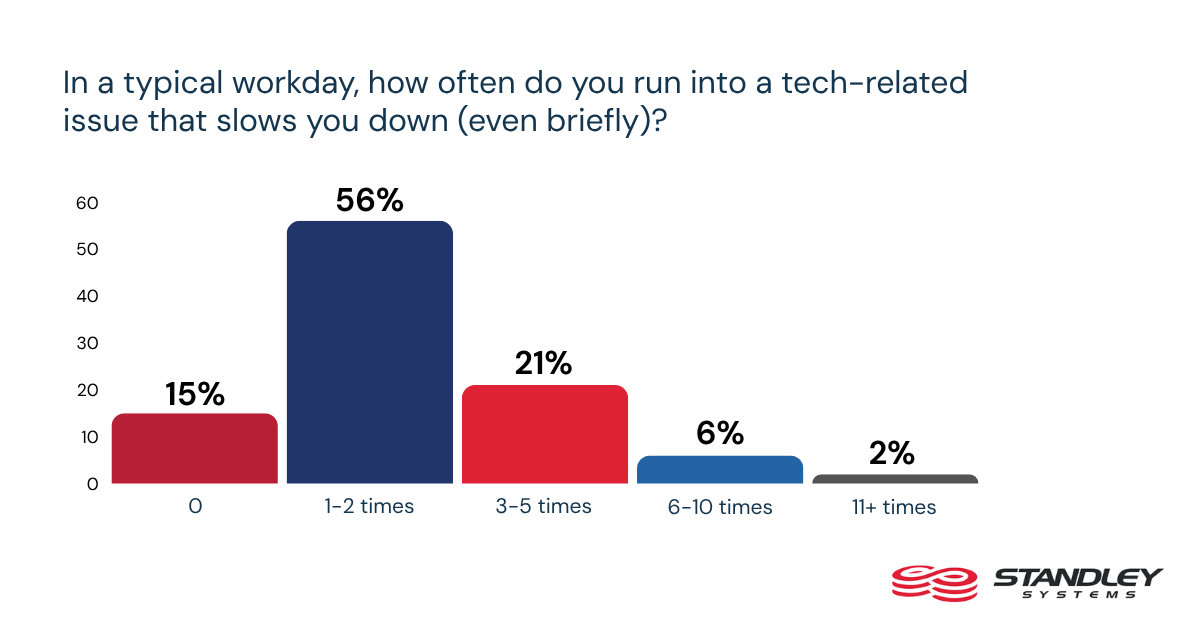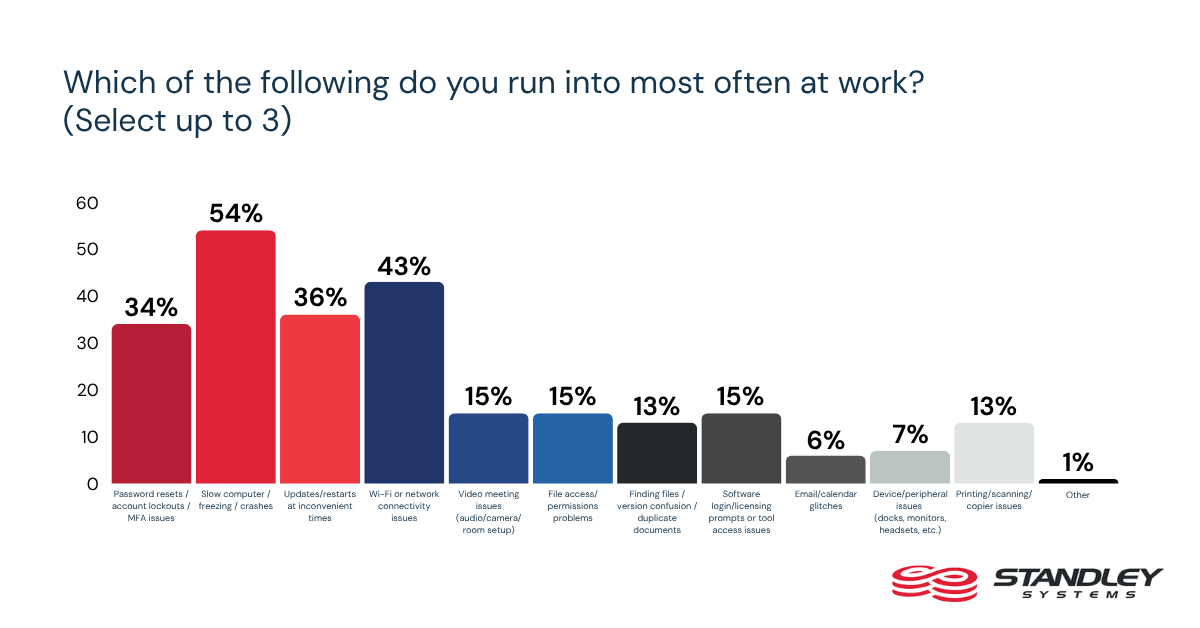 Rather than appearing as occasional setbacks, these issues show up as routine interruptions in the flow of work. Nearly 85% of desk workers say they run into a tech-related issue that slows them down at least once per workday, including 56% who say it happens 1 to 2 times a day and 29% who say it happens 3 or more times. For most workers, these interruptions are no longer exceptions. They are built into the rhythm of the workday.