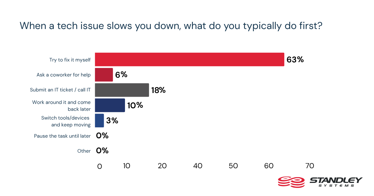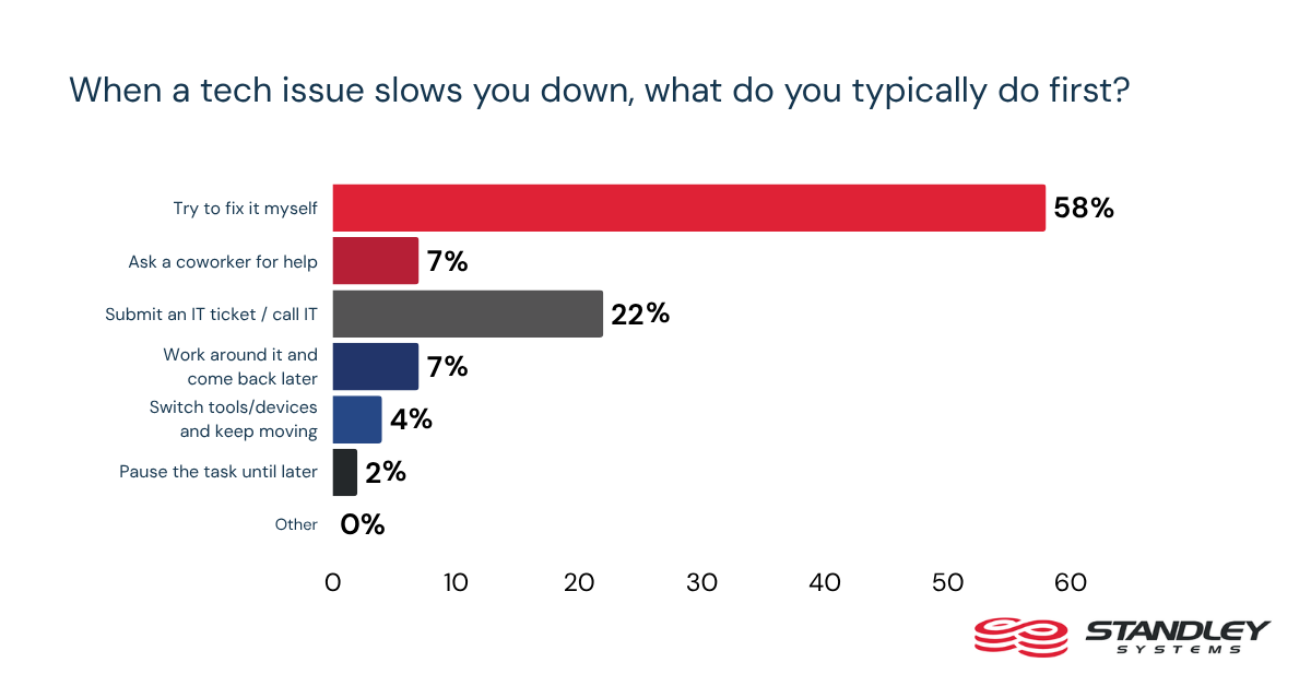 One of the clearest patterns in the survey is how often employees choose self-repair over formal support. When a tech issue slows them down, 58% say their first move is to try fixing it themselves. Only 22% say they submit an IT ticket or call IT first. For many workers, the fastest path forward appears to be handling the problem on their own.