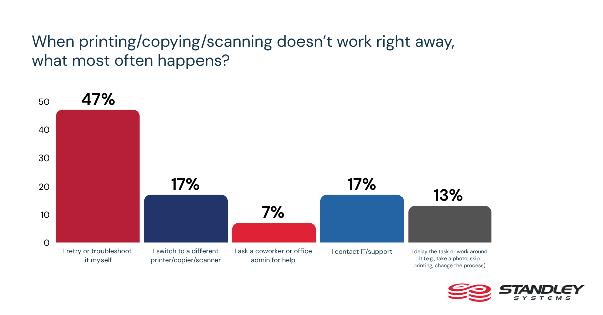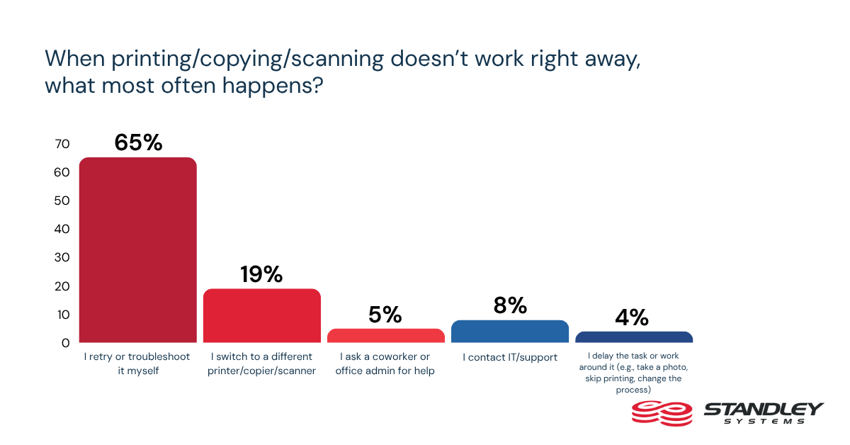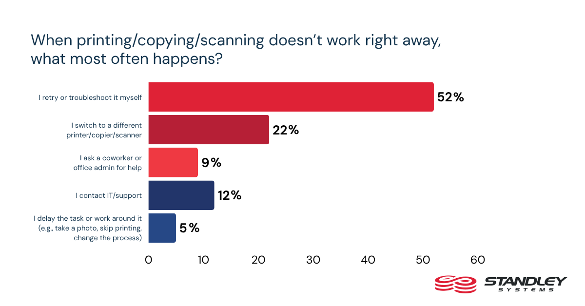 Printing, copying, and scanning are basic office tasks, but reliability is far from a given. Only 18% of workers say printing, copying, or scanning always works correctly on the first try. When those tasks fail, 52% say they retry or troubleshoot the issue themselves, while 22% switch to another device. That suggests print and copy problems continue to create avoidable disruption in the flow of everyday work.
