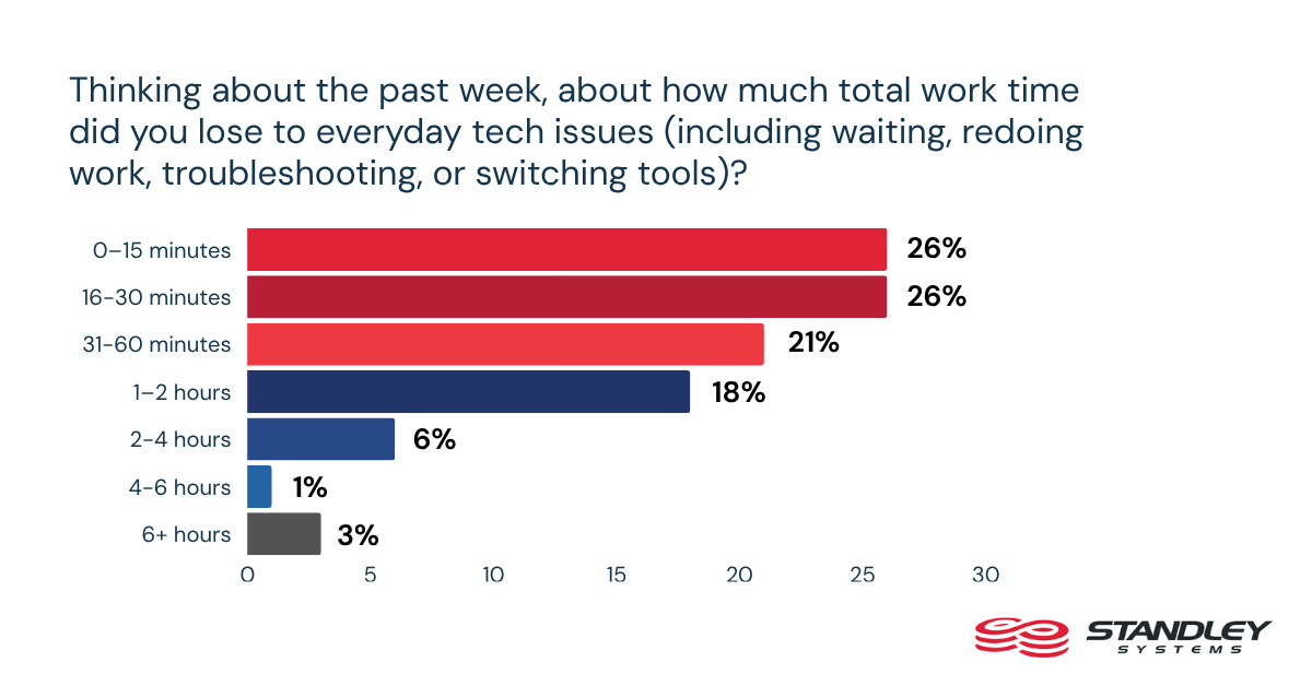 These findings from the 2026 Standley Systems Office Technology Report show that routine tech slowdowns are not minor inconveniences on the edge of the workday. They are recurring interruptions that consume time, break focus, and push employees toward self-troubleshooting and workaround behavior instead of fast, reliable resolution.
