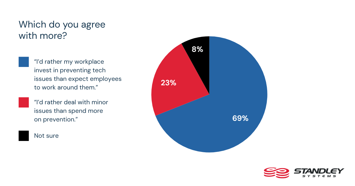 The Standley Systems survey makes clear that employees are not simply resigned to this level of disruption. Most would prefer workplaces that prevent routine tech issues rather than expecting workers to adapt around them. In fact, 69% say they would rather their workplace invest in preventing tech issues than expect employees to work around them.