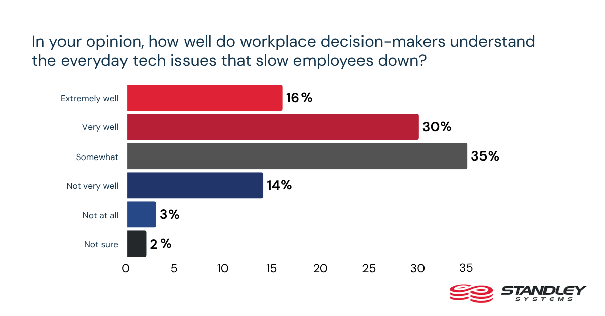 Routine technology problems shape the workday in ways that may not always be visible beyond the employee experience. Many workers do not believe workplace decision-makers have a full understanding of the everyday tech issues that slow them down. Only 16% say decision-makers understand these issues extremely well. Another 30% say they understand them very well, but the largest share, 35%, say that understanding is only somewhat strong. Nearly 1 in 5 say decision-makers understand these problems not very well or not at all.
