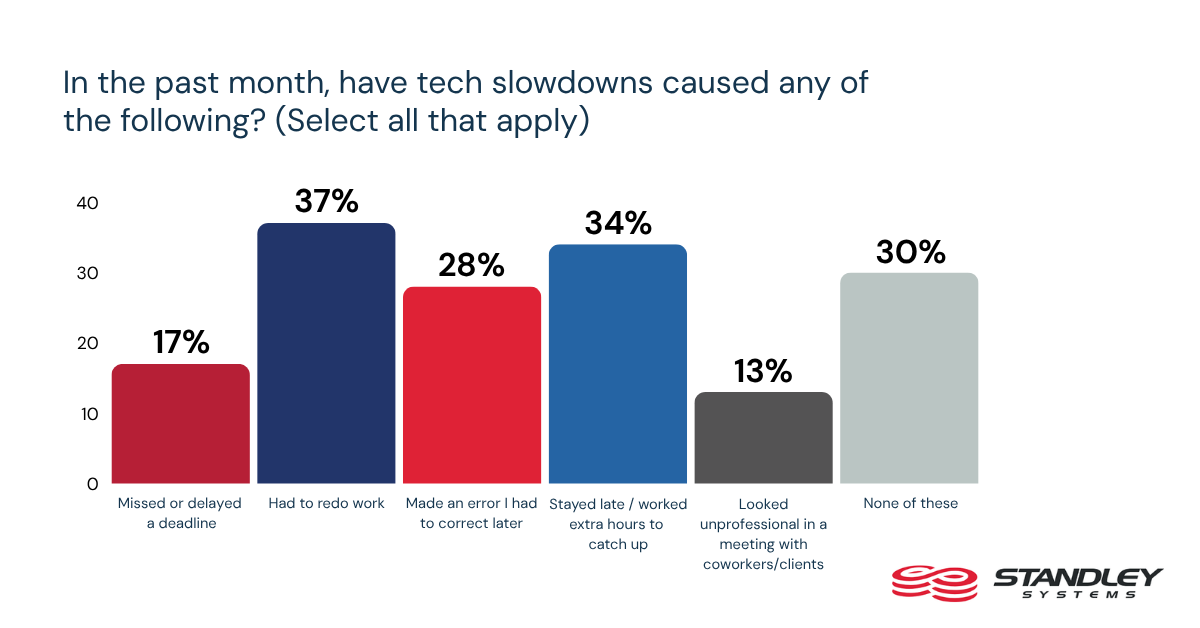 Those disruptions also carry practical consequences for the work itself. In the past month, 37% say tech slowdowns forced them to redo work, 34% say they stayed late or worked extra hours to catch up, 28% say they made an error they had to correct later, and 17% say they missed or delayed a deadline. Routine office disruption is affecting not only speed, but also work quality and schedule control.