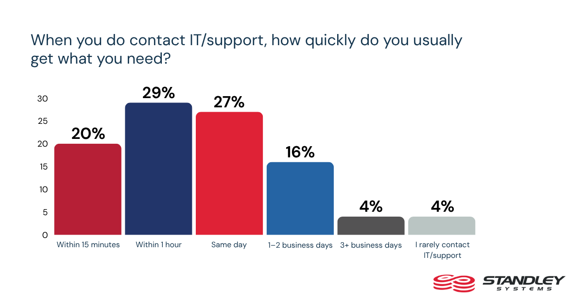 That instinct is reinforced by how workers view support itself. About 76% say they avoid contacting IT at least sometimes because it feels like more effort than it is worth. When they do reach out, response times are mixed. About 20% say they usually get what they need within 15 minutes, 29% say within an hour, and 27% say the same day. Those numbers are not catastrophic, but they suggest enough friction in the support process to push many workers toward workaround behavior.