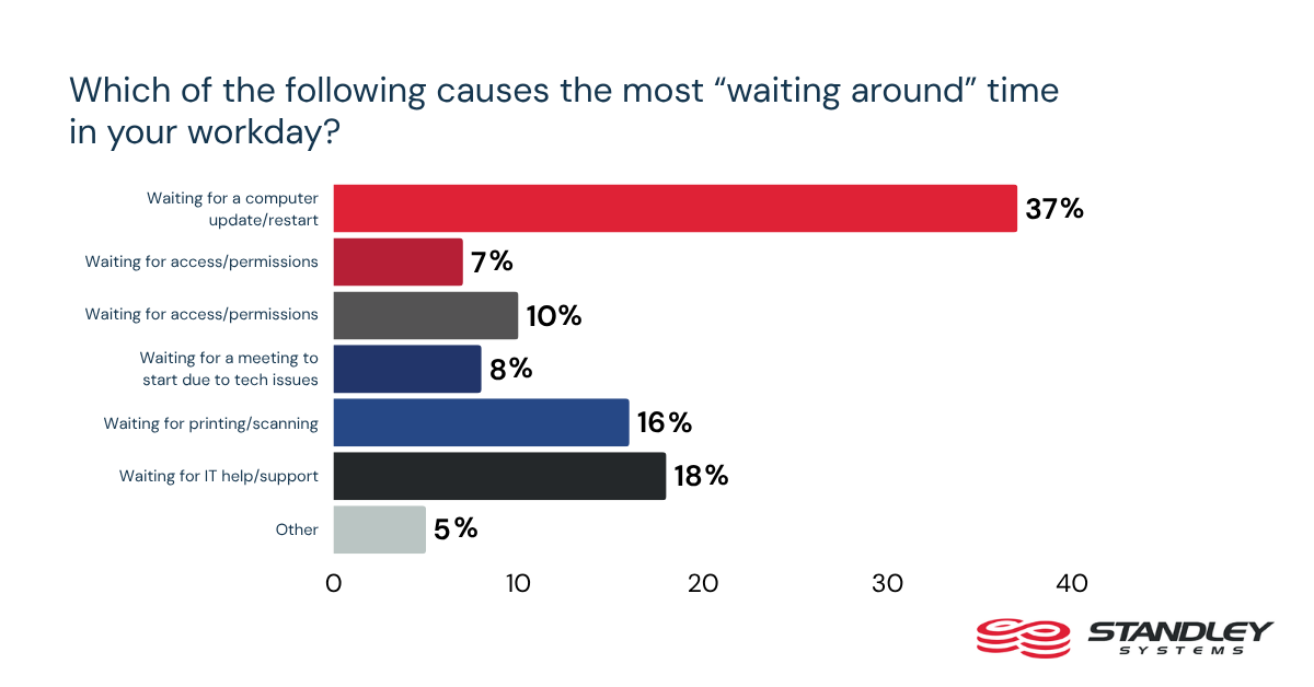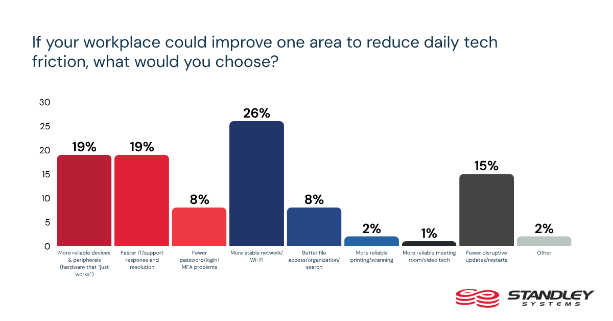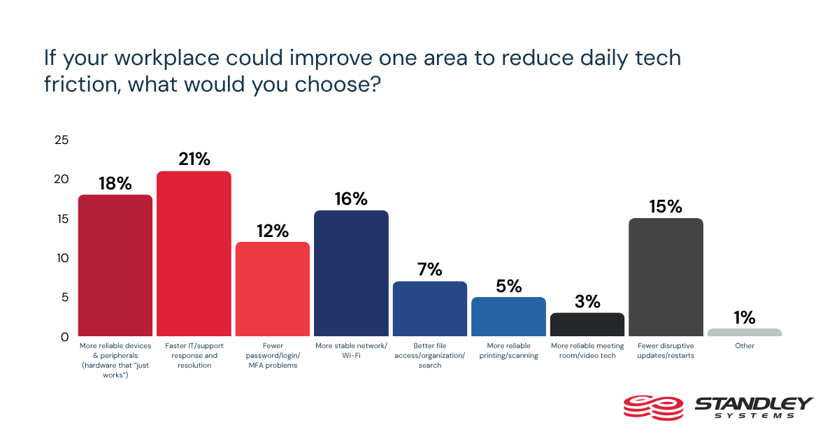 Asked what one improvement would most reduce daily tech slowdowns, workers put faster IT and support response first at 21%. That is followed by more reliable devices and peripherals at 18%, more stable network and Wi-Fi at 16%, and fewer disruptive updates and restarts at 15%.