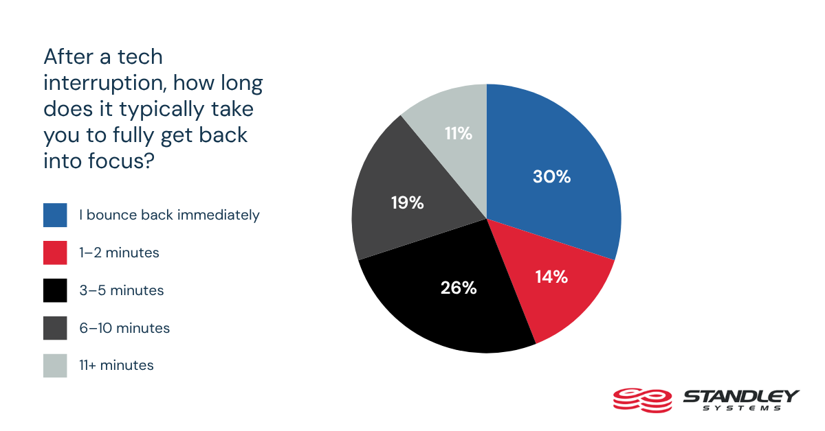 The time spent resolving a problem is only part of the productivity loss. Tech interruptions also make it harder for workers to return to the task they were doing before the glitch. Only 30% say they regain focus immediately after a tech interruption, while another 30% say it takes at least six minutes to fully get back on track. Even after the issue is fixed, many workers are still trying to recover their momentum.