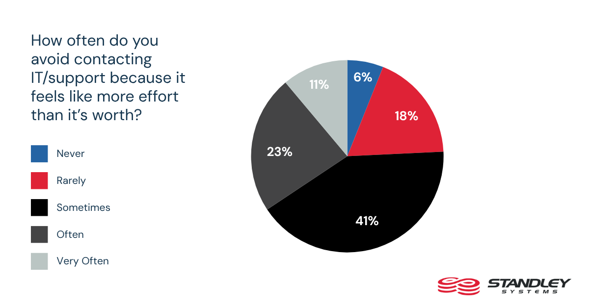 - 58% say their first response to a tech issue is to try fixing it themselves, and 76% say they avoid contacting IT at least sometimes because it feels like more effort than it is worth.